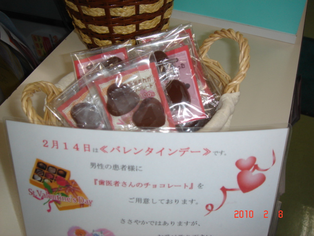 今週末はバレンタインですねヽ(^o^)丿そこで・・・・・今年もやります!!来院して頂いた方全員に≪キシリトールチョコ≫をプレゼント♪♪普通のチョコに比べて@虫歯予防AカロリーoffB糖尿病の方に最適でも味はおいしいんです!!この機会にお試し下さい(*^^)v