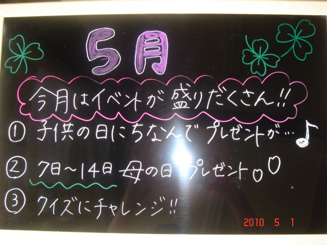 さて、5月にもなり待ちに待ったGWですね♪ヽ(^o^)丿嬉今月はイベントがたくさんあります!>@端午の節句にちなんで子供たちにプレゼントが・・☆A7日〜14日までは母の日のプレゼントをご用意♪ ・・・日頃の感謝をこめて。B新企画!!クイズにチャレンジ!!ぜひお声かけて下さいね♪そろそろ桜も見頃でしょうか。楽しみです(*^_^*)