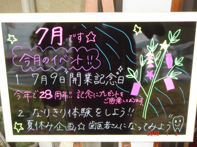 そろそろ夏本番ですね♪海にBBQ、花火・・楽しみですね(^_-)-☆さて、今月はつのだ歯科の開業記念日や夏休み企画などイベントを企画しております☆ぜひぜひ楽しみにしててくださいね♪
