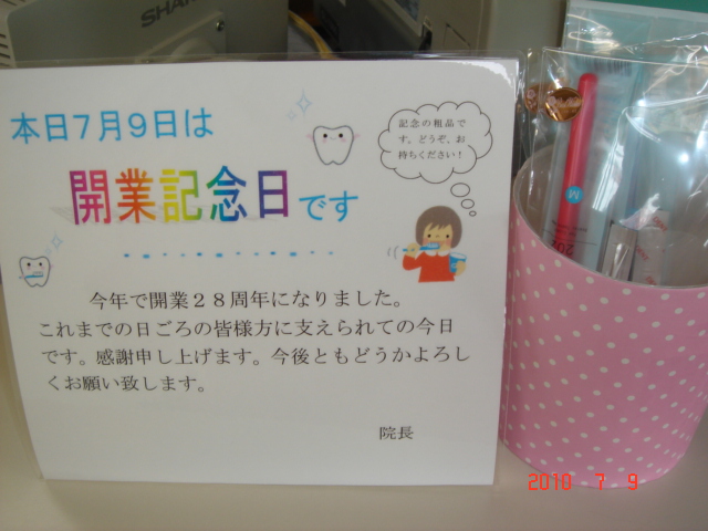 今日、7月9日はつのだ歯科の開業記念日です☆皆様に支えられて、今年で28周年になります\(^o^)/感謝申し上げます。そしてこれからもどうぞよろしくお願い致します<(_ _)>今日のみですが記念に粗品をお渡ししてます。ぜひ気軽にお声かけて下さい♪
