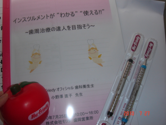 この間の25日は盛岡で行われた講習会に参加して来ました!衛生士の大平さんと佐々木さん、わたし(小田中)の3人で行って来ました☆内容はスケーラーのシャープニングとSRP(歯石取り)についてでしたヽ(^o^)丿技術を磨くのはもちろん、普段使っている器具たちもしっかりメンテナンスしていかなくてはと実感しました!!また、操作するときのポジショニング、どうすればらりやすく患者さまに負担がかからないかとても勉強になりました(*^_^*)歯科衛生士の職業病?は腰痛、肩こり、腱鞘炎・・(私的に・・)自分の体のメンテナンスも大切ですね(+_+)講習会で得たことを、より良い形で皆様に提供していけるように頑張りますね!(^^)!ちなみに、写真に写っているりんごはストレッチボールです(*^^)v手や腕が疲れた時ににぎにぎします!!(笑)