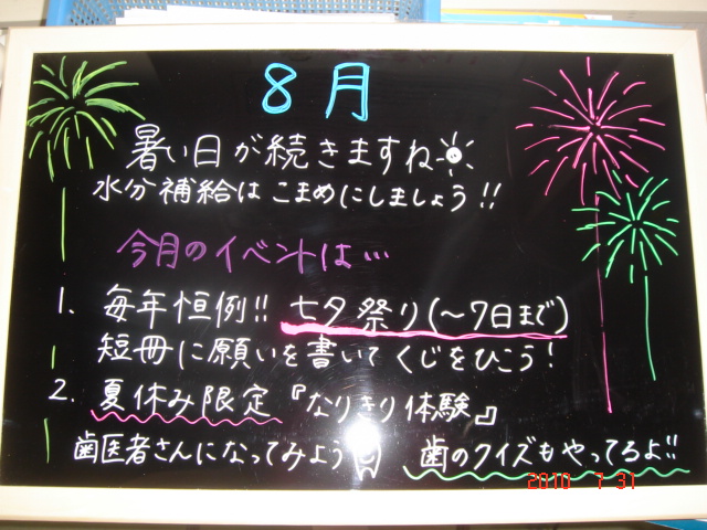 お祭りや花火の季節ですね♪岩手の夏!!!さんさ踊りも始まりましたね。初日が日曜だったので見て来ましたよ☆今月のつのだ歯科のイベントは・・@七夕祭り♪願い事を書いてクジをひこう!!A夏休み企画☆なりきり体験!※歯のクイズも引き続き行っていますヽ(^o^)丿気軽にお声かけてくださいね♪♪