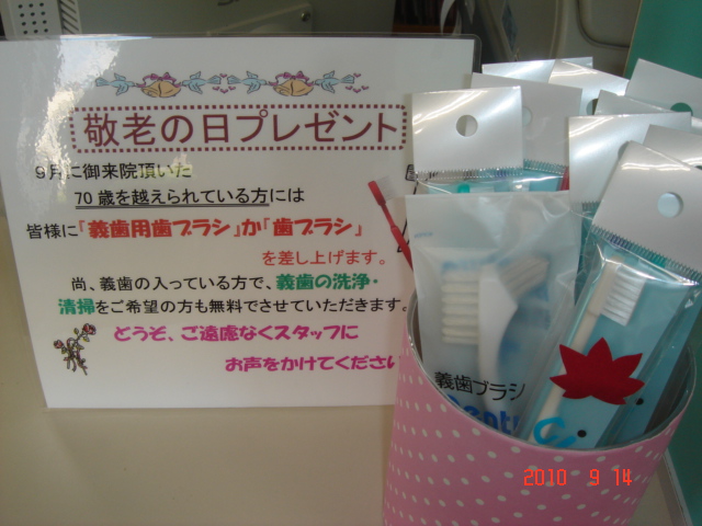 敬老の日☆日頃の感謝を込めて、義歯用歯ブラシor歯ブラシをお配りしています♪今月いっぱいお配りしているので、どうぞお気軽にお声かけて下さい(^o^)丿義歯の洗浄も無料で行ってますよ〜☆お気軽にどうぞ♪