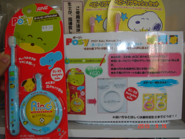 歯ブラシ販売コーナーに新しい歯ブラシが新登場ですヽ(^o^)丿その名も・・・『ポージィ ベビーリブラッシュセット』リング型の歯ブラシは可愛くて楽しく歯みがきの練習ができそう!!仕上げ用の歯ブラシもセットになっています(*^^)vくまさんと、スヌーピー。2種類あります☆気になる方はぜひ手にとって見て下さい(*^_^*)