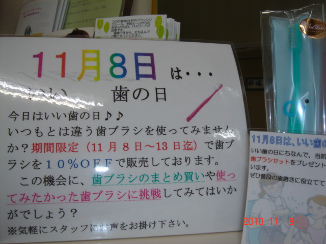 今週8日はいい歯の日でしたヽ(^o^)丿それにちなんで今週はキャンペーンを行っています。@歯ブラシ10%OFF!!受付に置いてある歯ブラシ、どれでも対象です。この機会にぜひお買い求めくださいね(^_-)-☆A歯ブラシセットプレゼント!!今週来て頂いた方にお配りしてます♪受付にも置いてありますので、ぜひお持ちください。どちらも13日まで行っています(*^_^*)