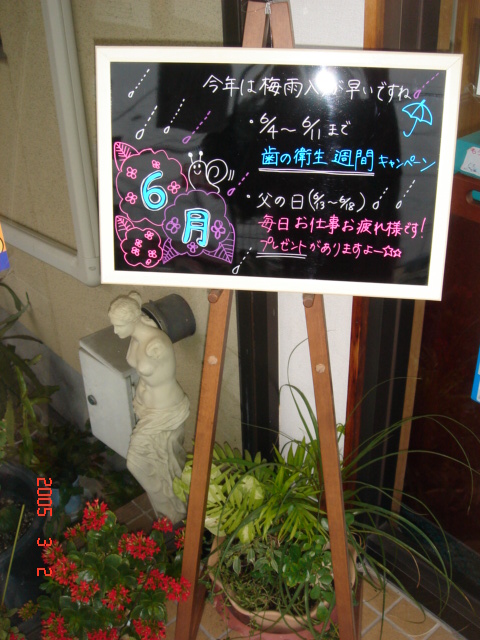 梅雨の時期になってきました(>_<)今月は『歯の衛生週間』や『父の日』のイベントを開催します★それぞれプレゼントありますよ〜(*^^)vこの間は赤石小学校にて歯科検診を行って来ました!(^^)!私事ですが健診前に外でこけて、膝と手のひらを擦りむきました(笑)健診中は、痛い!でも書かなきゃ・・と一人格闘してました^_^;