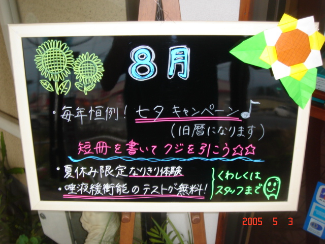 みなさん夏休みには入りましたか〜(*^_^*)??今月は七夕のイベントを開催中です!(1ヶ月遅れで行ってます)短冊を書いてクジを引こう★☆ハズレなしなので何が当たるかはお楽しみ〜(^_-)-☆先月に引き続き、唾液緩衝能の検査を無料で行っています!夏休み限定なりきり体験も随時募集中です♪詳しくはスタッフまで♪♪