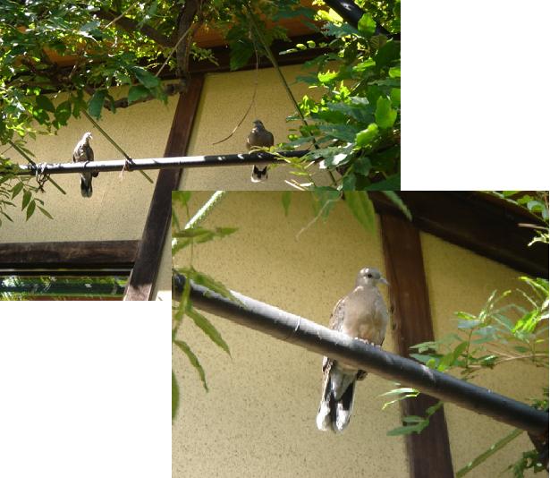 庭木にいた鳩が大きくなっていました\(◎o◎)/!なにやら飛ぶ練習をしているようです♪親鳥が見本で先に飛んで、子供に教えていましたよ〜(*^_^*)ほほえましいですね!数日前の写真なので、もう飛べるようになったでしょうか。