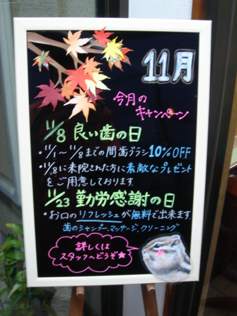 すっかり肌寒くなりましたね(+_+)今年もあと2カ月です。早いですね〜年々、1年が過ぎていくのを早く感じている今日この頃です笑!今月は・・・【イイ歯の日(11/8)】【勤労感謝の日】にちなんだイベントを行っています!!8日迄ハブラシ10%OFF!!また洗口剤のおためしや、お口のリフレッシュキャンペーも行っています(*^_^*)詳しくはスタッフまでどうぞ〜★☆