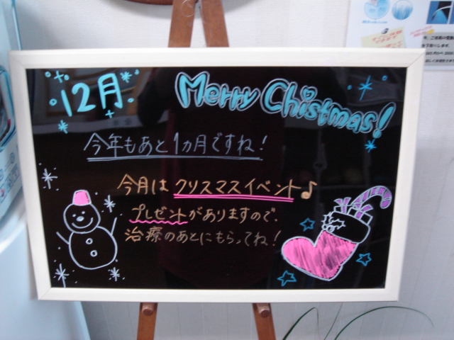 今年も残りわずか!!早いですね・・(>_<)今月はクリスマスキャンペーン♪♪よい子の皆にクリスマスプレゼントがあるよ★治療が終わったら貰ってね(^_-)-☆雪がチラつくようになりましたね。雪道の運転は怖いので、どうか積もらないようにと祈るばかりです・・^_^;