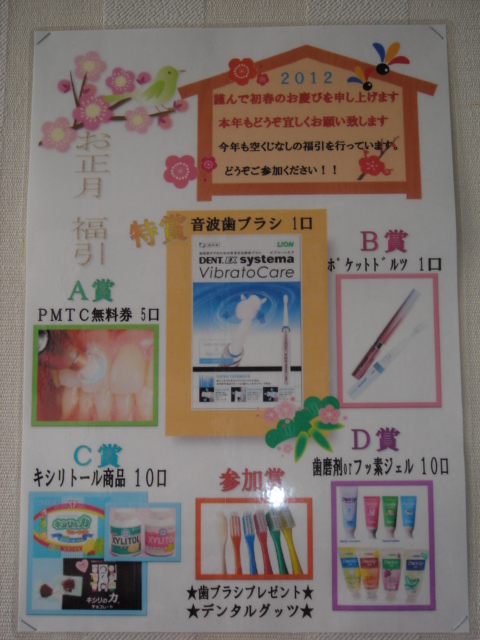 今年もやってきました福引大会(*^^)v14日まで行っていますので、ぜひお楽しみに★今回の特賞は音波ブラシ《ビブラートケア》!!みなさん何が当たるでしょうか??ぜひいらしてみて下さいね♪お待ちしております<(_ _)>