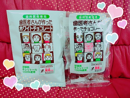 こんにちは!アシスタントの畠山です。皆さんは、チョコがお好きですか?私は好きです!チョコは虫歯になりやすい食べ物です。小さいお子さんにあまり食べさせたくないという方もいると思います。そこで紹介したいキシリトールチョコレートがあります!キシリトールの作用で虫歯菌の繁殖を防ぎ、プラークを減少させると言われています。・お子さんの歯磨き習慣のために!・キシリトールの代謝はインシュリンに依存しないため、血糖値を上昇させません。糖尿病や妊婦の人が摂取しても問題はありません!お子さんだけでなく、どの年代の方にもおすすめです!当病院で購入できます!ぜひ一度試してみてはいかがですか?