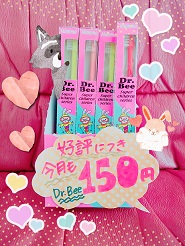 こんにちはっ♪受付の佐藤です(*・ω・*)仕上げ磨き用歯ブラシDr.Bee¥180(税別)ですが¥150(税別)で販売中です(●^^●)♪先月のキャンペーン限定だったのですが、好評だった為延長になりました!!!小学校3〜4年生の歯が生えそろってないお子さんが使うのにもおススメの歯ブラシです♪受付にて販売中ですぜひぜひお使いになってみてください(*^^*)b健康はお口の中から!佐藤でした(●・ω・●)