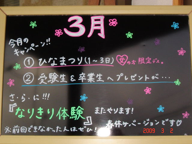 今月のキャンペーンは・・・@ひなまつり(2〜3日)Aお受験&卒業 この2つですヽ(^o^)丿さらに春休み企画としてまたやります!『なりきり体験 春休みver.』前回出来なかった人は是非挑戦してみよう!!